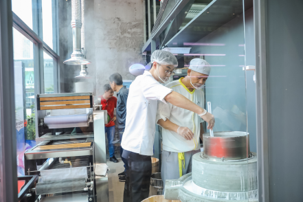 一般的越南河粉店用的是進口貨,就算來源再好,在運輸過程中總有味道和韌度的流失。傳統(tǒng)河粉機屬于大型設備,蔡瀾團隊經(jīng)過22個月的研發(fā)和改良,縮小尺寸才能將機器陳列于餐廳,讓顧客見證新鮮河粉生產(chǎn)制作的全過程:大米浸泡至軟,石磨磨成米漿再蒸熟、切割成河粉,用心打造出一碗新鮮美味的Pho。