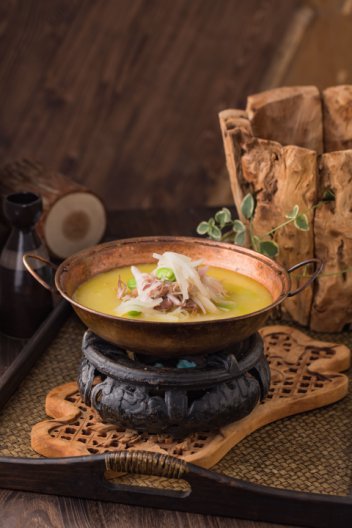 食材多來自水澤,藕帶、菱角、茭白、蠶豆瓣、大蝦仁,自制蝦醬爆炒起香,時蔬的白綠點綴蝦仁的淡粉,如青荷托芙蓉之色,砂鍋盛上,滋滋作響,讓人眼前浮現(xiàn)出“蛙聲喧夏夜,魚影動荷塘”的畫面。