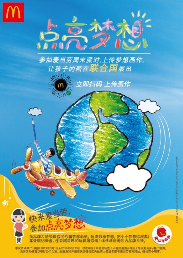 3月1日起, 麥當勞在全國超過1000家餐廳推出麥當勞“點亮夢想”主題派對,為孩子們打造夢想加油站?;顒右浴皦粝搿睘橹黝},以繪畫為載體,鼓勵孩子們秀出才華展現夢想?;顒訉⒄鬟x30位兒童的畫作在聯合國展出。