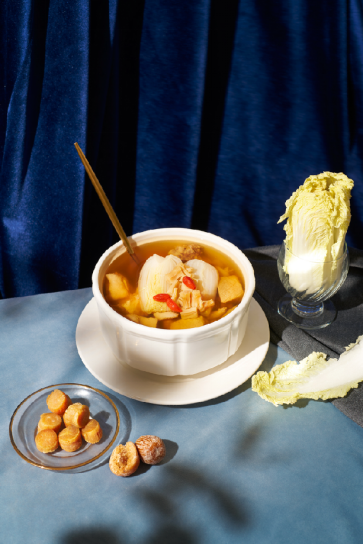 瑤柱菜膽燉土豬展湯,80頭干瑤柱經(jīng)過發(fā)泡,和優(yōu)選食材的土豬肉,娃娃菜一塊入燙盅燉6小時(shí)。水甘味甜,有滋補(bǔ)清潤(rùn)作用。