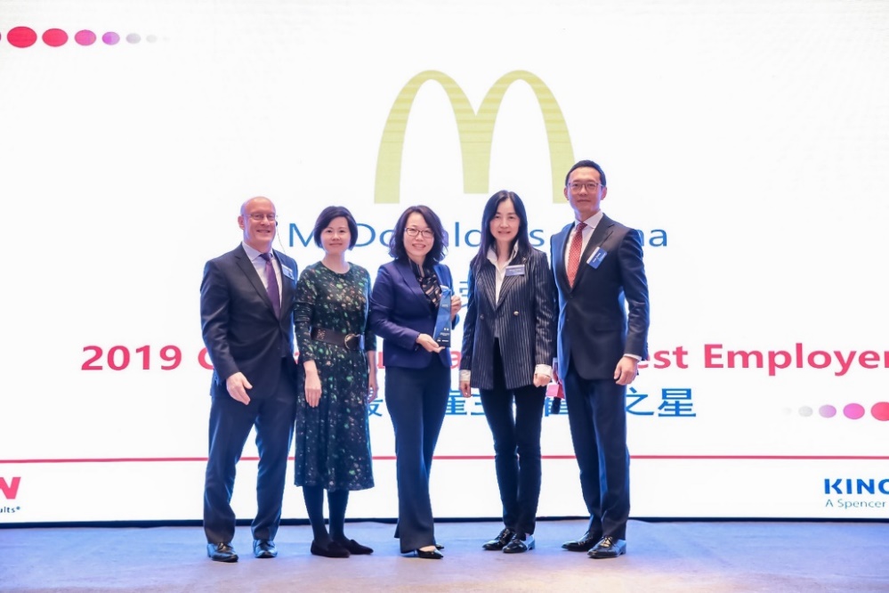 麥當(dāng)勞中國首席人員官王艷偉(中 )代表公司接受2019“怡安中國最佳雇主”稱號