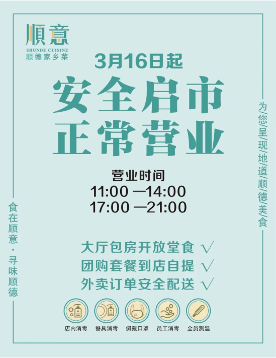 為了保證消費(fèi)者和員工的健康,順意順德家鄉(xiāng)菜做足的準(zhǔn)備工作,聘請(qǐng)了專(zhuān)業(yè)公司對(duì)全店進(jìn)行專(zhuān)業(yè)消毒凈化,每個(gè)員工上崗前均進(jìn)行測(cè)量體溫、深度清潔雙手等措施,服務(wù)員在服務(wù)時(shí)也秉承無(wú)接觸的原則,傳菜加蓋隔離、餐具高溫消毒、到店測(cè)溫、安心送等種種服務(wù)讓消費(fèi)者感到安心。