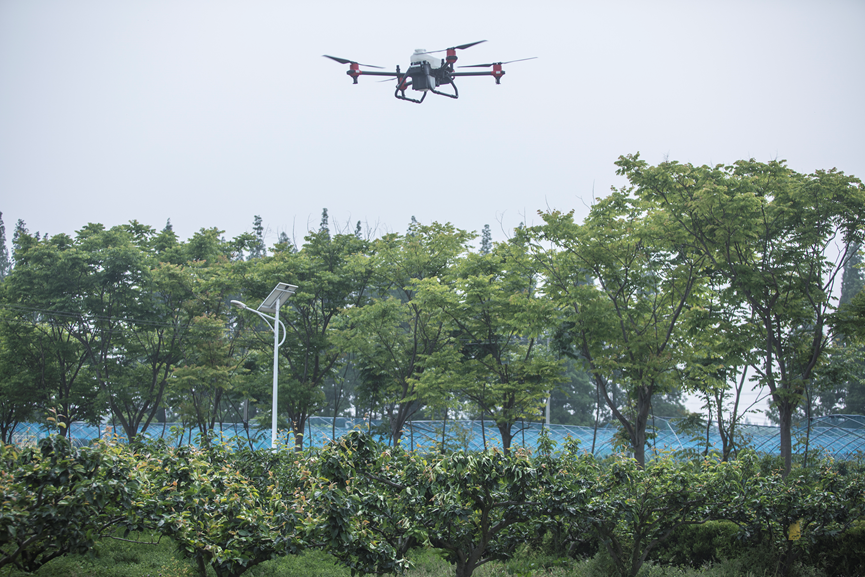 (上海首個(gè)盒馬村,翠冠梨數(shù)字農(nóng)業(yè)基地,無(wú)人機(jī)正在低空施藥)