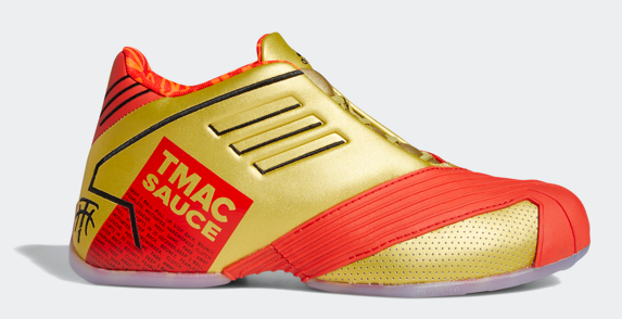 ? TMAC 1: 聯(lián)名款TMAC1采用金 屬色鞋面,搭配紅色細(xì)節(jié),外底綴金色拱門印花,致敬巨無霸醬——風(fēng)靡全球的巨無霸漢堡的獨(dú)特醬料。同時(shí)該鞋款也蘊(yùn)含麥蒂獨(dú)特“風(fēng)味配方”:干拔跳投、三分球、背身單打。