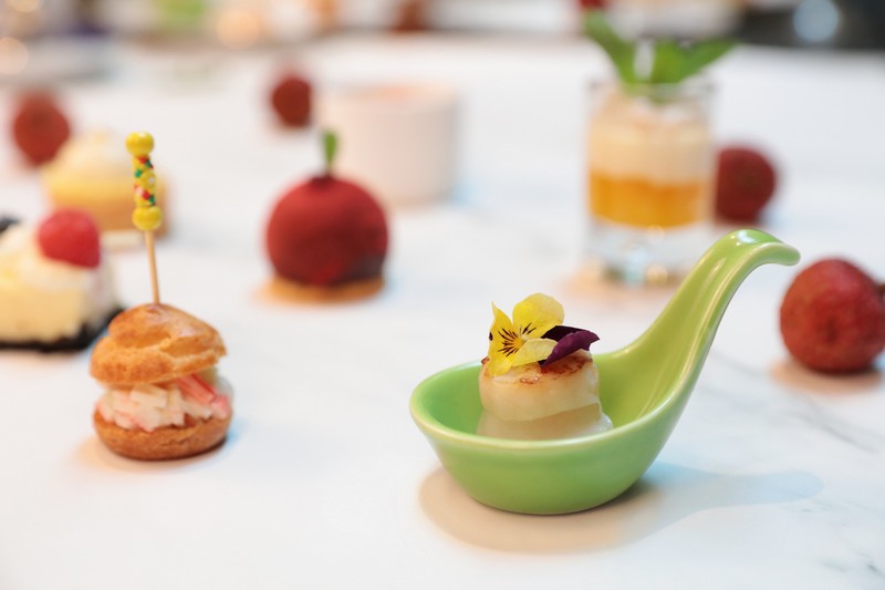 酒店餅房廚師長(zhǎng)趙偉匠心獨(dú)運(yùn),使荔枝和傳統(tǒng)下午茶碰撞出別樣風(fēng)情:芒果恰到好處的酸甜邂逅荔枝的宜人甘美,香芒荔枝慕斯杯里滿載的不就是夏天的專屬甜蜜;芝士蛋糕的醇厚滋味被荔枝的清爽巧妙平衡,多層次的口感讓人無(wú)限回味;當(dāng)俏皮可人的荔枝被加入傳統(tǒng)甜品楊枝甘露,搭配冰涼爽口的荔枝雪芭,是妙趣橫生的獨(dú)特味覺(jué)體驗(yàn);法式焦糖燉蛋和荔枝的融合,恍若天成,是中西合璧的典范;日本帶子和荔枝的組合聽來(lái)不可思議,只有親試方能體會(huì)海陸鮮甜交匯的真意。