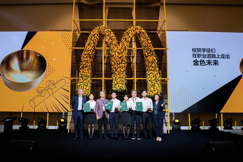 麥當(dāng)勞領(lǐng)導(dǎo)們、陳李翔和陳宇向四位首批畢業(yè)生代表贈(zèng)送“出師證”和金碗,并向未來(lái)學(xué)徒發(fā)出邀請(qǐng)
