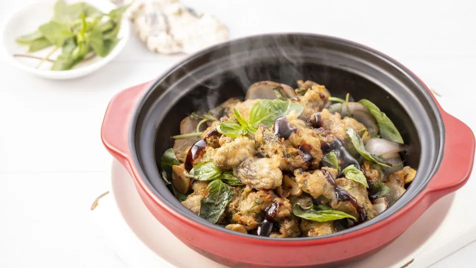 九層塔香燜海蠣:九層塔獨特的香料風味,經過細火干燜,完全滲入到每粒海蠣肉里,趁熱吃,特別香!