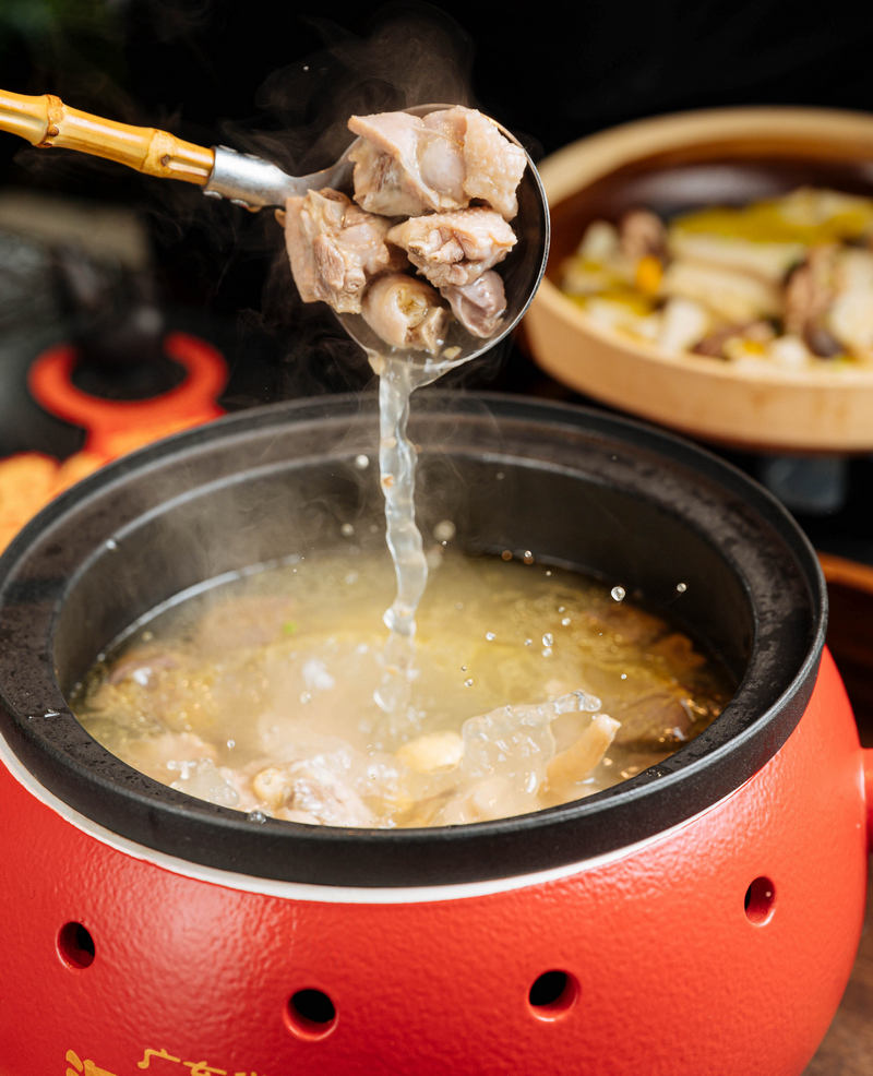以雞為主要烹飪食材,洞庭土雞館的湖南師傅創(chuàng)造出了不一樣的菜肴。每桌食客坐下,都少不得一碗暖乎乎的洞庭土雞湯來(lái)“開(kāi)場(chǎng)”。它的登場(chǎng)也相當(dāng)有氣勢(shì),長(zhǎng)沙紅磚窯特別定制的大湯鍋,內(nèi)膽是紫砂構(gòu)造,這樣的設(shè)計(jì)既是出于美觀,又是出于更長(zhǎng)時(shí)間更有效保溫的效果。俗話說(shuō)得好,工欲善其事必先利其器。土雞方面,師傅特別精選了湖南竹山雞,肉質(zhì)的彈性略勝一籌,據(jù)介紹,竹山雞的養(yǎng)殖戶開(kāi)放了大片山頭讓雞跑,放養(yǎng)時(shí)間足夠長(zhǎng),達(dá)到一年多,在如今快節(jié)奏的社會(huì)里已實(shí)屬難得。老雞加山泉水文火熬3個(gè)小時(shí),并沒(méi)有其他的味道干擾,簡(jiǎn)簡(jiǎn)單單就是本味。