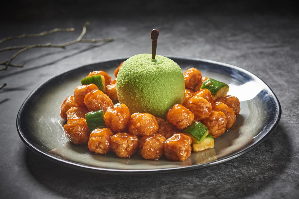 青蘋果造型的太空蛋,輕輕一敲,涌動的慕斯傾瀉而出,咕嚕肉的酸甜與慕斯的奶甜,吃起來有滋有味,是恍如隔世的初戀味道,是記憶中那份美好的味道。