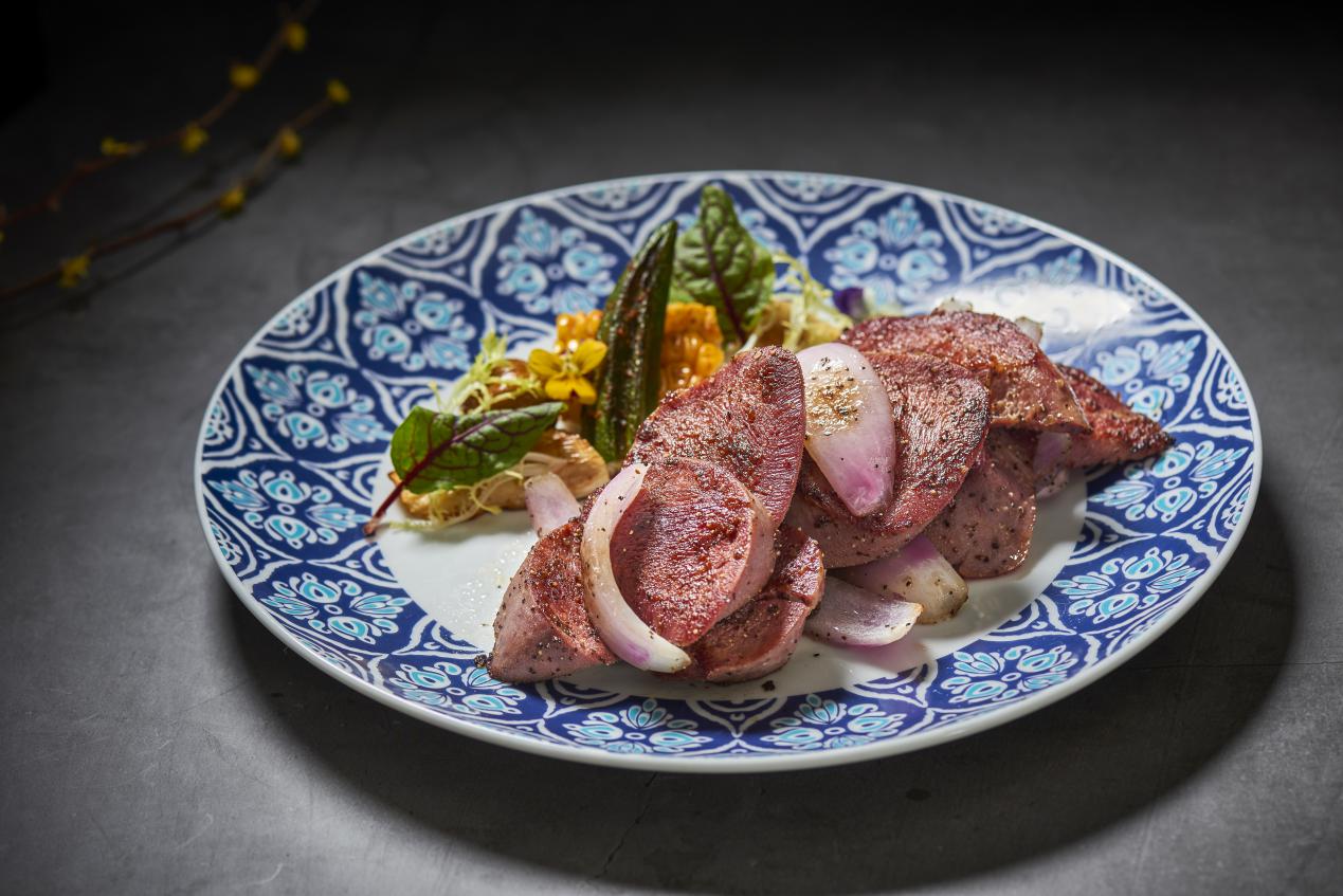 高溫巖燒過的牛舌,撒以黑椒調(diào)味,口感細(xì)嫩,厚切帶來的幸福感,激活疲乏味蕾,純粹原始的咸香即瞬蘊(yùn)繞口腔。