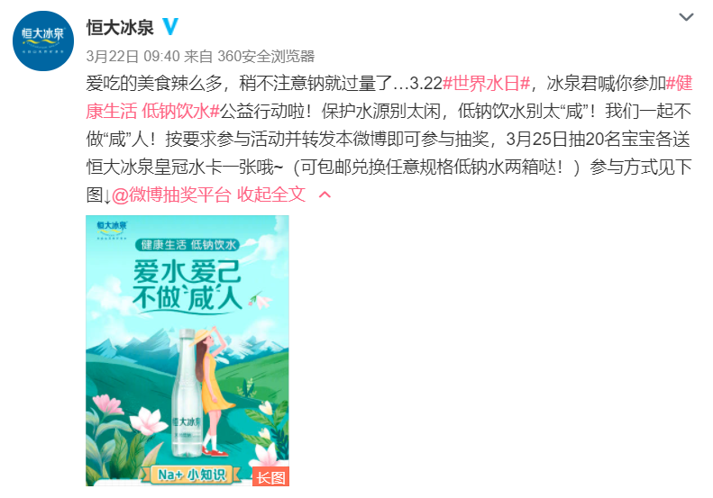 見(jiàn)圳客戶端·深圳新聞網(wǎng)2021年3月30日訊 (記者 常軍平)目前正值3月22日第二十九屆“世界水日”以及3月22—28日第三十四屆“中國(guó)水周”之際,恒大冰泉天然低鈉礦泉水深入洞察借勢(shì),發(fā)起以不做“咸”人為主題的公益活動(dòng),引發(fā)了全網(wǎng)的關(guān)注熱議和積極參與,刷屏社交媒體,成為新的公益“爆款”。