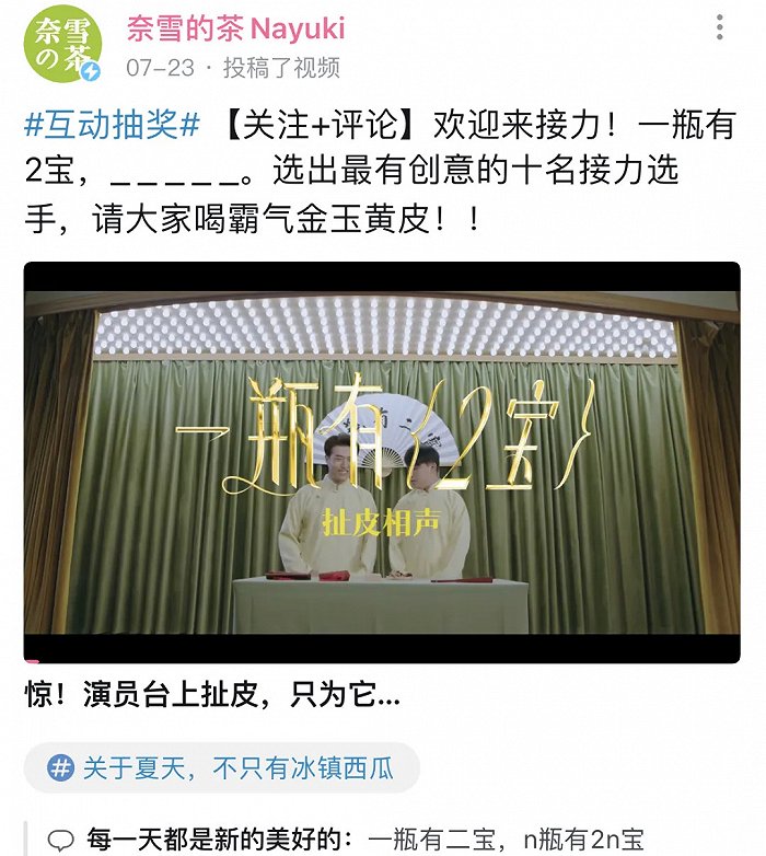 在此之前,奈雪曾用“說相聲”的方式推霸氣金玉黃皮,讓茶飲和相聲組CP;霸氣生椰斑斕上架時(shí),他們出了個(gè)東南亞風(fēng)滿滿的視頻,仿佛一秒到了泰國,創(chuàng)意有趣的同時(shí),也讓消費(fèi)者對(duì)產(chǎn)品留下深刻印象。