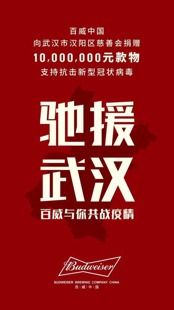 在全民防控新型冠狀病毒肺炎疫情的關鍵時刻,百威中國向武漢市漢陽區(qū)慈善會捐贈1000萬元款物,以實際行動支持武漢疫情抗擊前線。