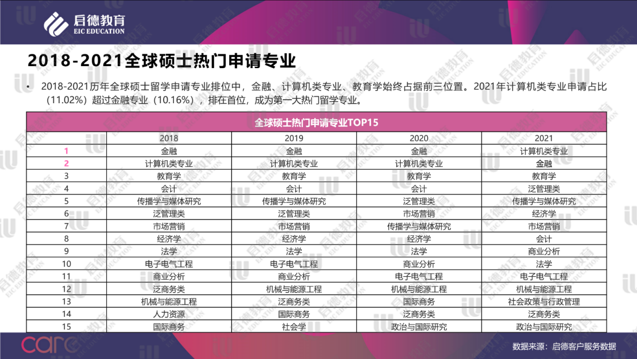 啟德留學(xué)客戶服務(wù)數(shù)據(jù)顯示,2018-2021歷年全球碩士留學(xué)申請(qǐng)專業(yè)排位中,金融、計(jì)算機(jī)類專業(yè)、教育學(xué)始終占據(jù)前三位置。2021年,計(jì)算機(jī)科學(xué)與信息系統(tǒng)(偏理科)、計(jì)算機(jī)科學(xué)與信息系統(tǒng)(偏工科)、電子與計(jì)算機(jī)工程、數(shù)據(jù)科學(xué)這四個(gè)計(jì)算機(jī)類專業(yè)的碩士申請(qǐng)占比合計(jì)為11.02%,超過(guò)金融專業(yè)(10.16%),成為第一大熱門(mén)留學(xué)專業(yè)。2021商科申請(qǐng)占比超過(guò)40%,理工科申請(qǐng)占比超過(guò)四分之一。其中,商科熱門(mén)碩士專業(yè)金融(10.16% )、經(jīng)濟(jì)學(xué)(4.63% )、市場(chǎng)營(yíng)銷(4.43% )、會(huì)計(jì)(3.92% )、商業(yè)分析(2.99% )的申請(qǐng)占比為26.13%,理工科熱門(mén)碩士專業(yè)計(jì)算機(jī)(11.02% )、電子電氣工程(2.66% )、機(jī)械與能源工程(2.15% )的申請(qǐng)占比為15.83%。