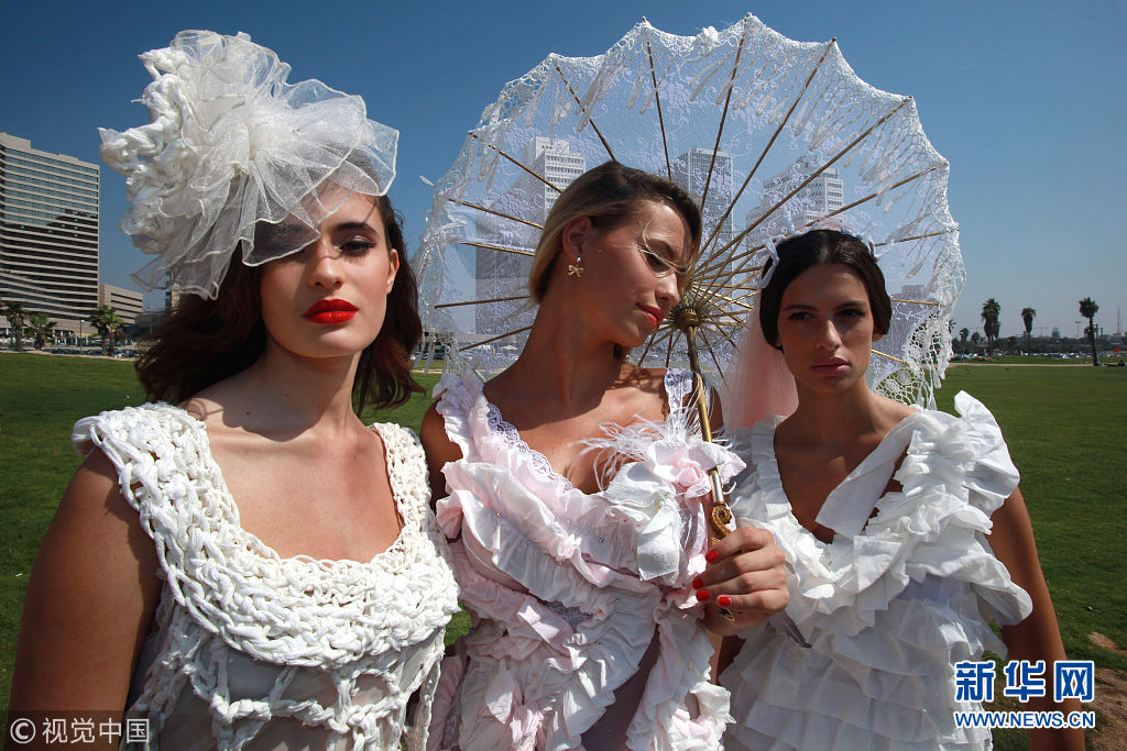 ????特拉維夫,模特身上穿著手紙制作的婚紗。9月9日是個(gè)大吉之日,大批新人將會(huì)在當(dāng)日扎堆結(jié)婚。(圖片來源:視覺中國(guó))