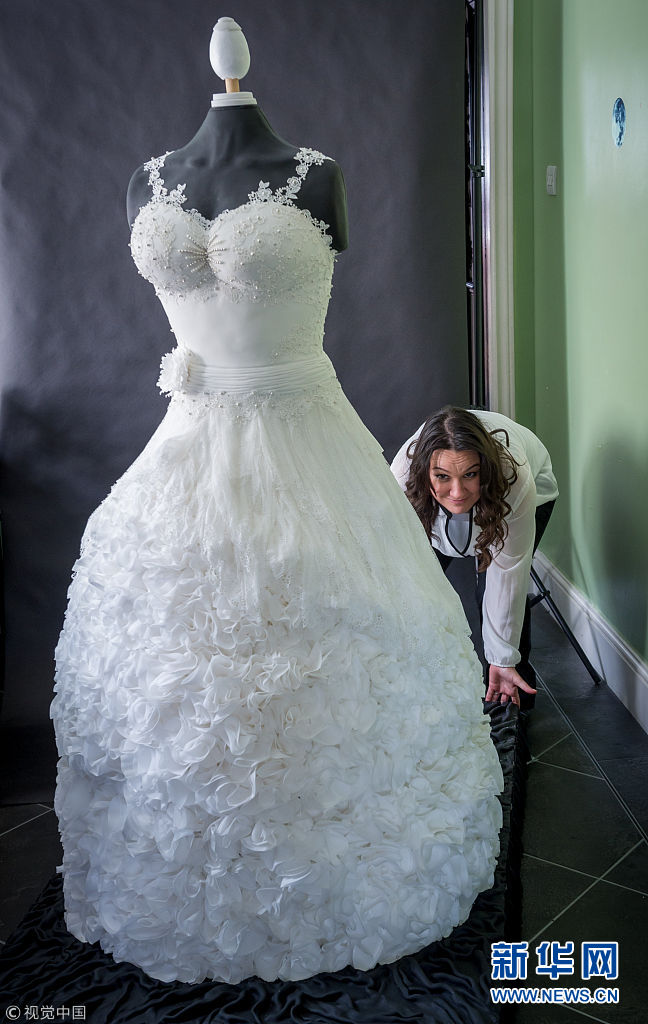 ????2016年4月11日訊(具體拍攝時間不詳),真實尺寸大小的婚紗蛋糕。蛋糕重140斤,高1.7米。它由著名的蛋糕師Sylvia Elba設計,并由Elba、Yvette Marner、Ilinka Rnic三人整整用了300多個小時方才完成。 (圖片來源:視覺中國)