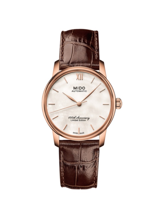 貝倫賽麗系列100周年限量款女士腕表擁有經(jīng)典、雅致的線條感,完美體現(xiàn)了瑞士美度表品牌歷經(jīng)歲月沉淀的經(jīng)典風(fēng)格與日漸精益的制表工藝。由PVD鍍玫瑰金不銹鋼表殼環(huán)繞其中的白色珍珠貝母表盤,盡顯高雅亮潔之姿。飽滿渾圓的葉形時針和分針經(jīng)過沖壓工藝處理,搭配PVD鍍玫瑰金立體鑲嵌刻度,將精致典雅隱藏于細節(jié)之中。透過其雙面鍍防眩目涂層藍寶石玻璃表鏡,表盤精美非凡的細節(jié)展露無遺;搭配做工細膩的棕色小牛皮軋鱷魚紋表帶,于復(fù)古典雅間,盡情釋放溫婉女性的曼妙風(fēng)韻。