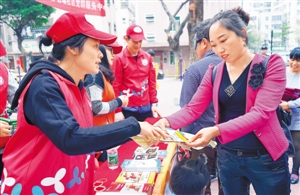 黨員志愿者向居民發(fā)放禁毒宣傳冊(cè)。
