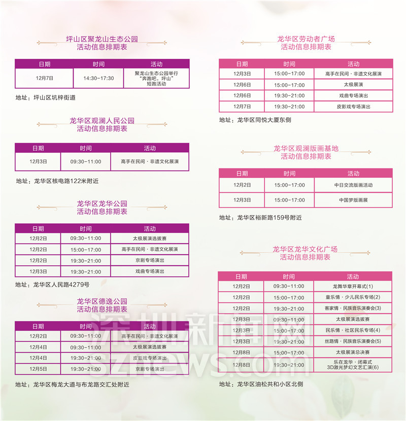 本屆公園文化周共設27個會場,其中市屬公園設11個會場,區(qū)屬公園設16個會場,這也是公園文化周自舉辦以來承辦會場最多的一屆。其中,福田區(qū)首次參與公園文化周,該區(qū)紅樹林生態(tài)公園以及今年新開放的香蜜公園均參與了本次活動。此外,坪山區(qū)的聚龍山生態(tài)公園,龍華區(qū)的龍華人民廣場、觀瀾人民公園、龍華公園、德逸公園、勞動者廣場均是首次參與“公園文化周”的承辦,讓更多市民在家旁邊就感受到公園文化和公園的建設成果。