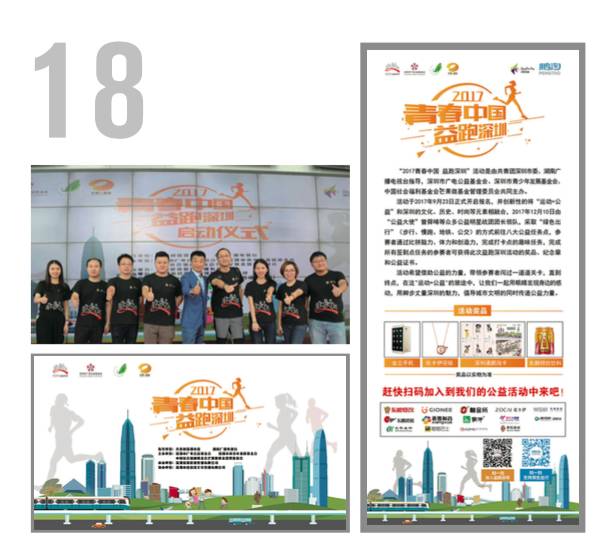 由深圳市廣電公益基金會(huì)、深圳市青少年發(fā)展基金會(huì)等主辦,深圳棠果影視傳媒有限公司承辦?!?017青春中國益跑深圳”活動(dòng)作為創(chuàng)意公益募捐慈善活動(dòng),通過招募深圳市民自愿以“綠色出行”(步行、慢跑、地鐵、公交)的方式完成城市穿越,從而為10個(gè)社會(huì)慈善項(xiàng)目進(jìn)行募捐的大型公益活動(dòng)。