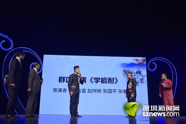 其后還有中國快板藝術(shù)委員會主任、著名快板書表演藝術(shù)家、非物質(zhì)文化遺產(chǎn)傳承人、中國曲藝牡丹獎得主李少杰帶來的經(jīng)典快板《天安門廣場看升旗》,質(zhì)樸的詞句,充沛的情感,以看升旗為出發(fā)點,表達(dá)的都是對國家的熱愛;古文新說題材的相聲《趣說文言文》,帶來了頗為新鮮的體驗;還有以深圳市鹽田區(qū)抗戰(zhàn)時期的真人真事改編的評書《龍嘴兒》、傳統(tǒng)相聲《大保鏢》和《學(xué)歌曲》等,曲種豐富多樣,令全場掌聲雷動,觀眾們贊不絕口。