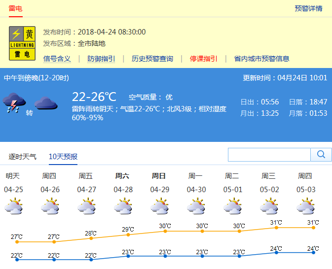 【深圳市雷電預(yù)警】深圳市氣象臺于2018年04月24日08時30分在全市陸地發(fā)布雷電預(yù)警,預(yù)計30分鐘內(nèi)全市將受雷電影響,按照防御預(yù)案停止戶外易燃易爆危險作業(yè),并加強(qiáng)?;瘓鏊踩芾?。