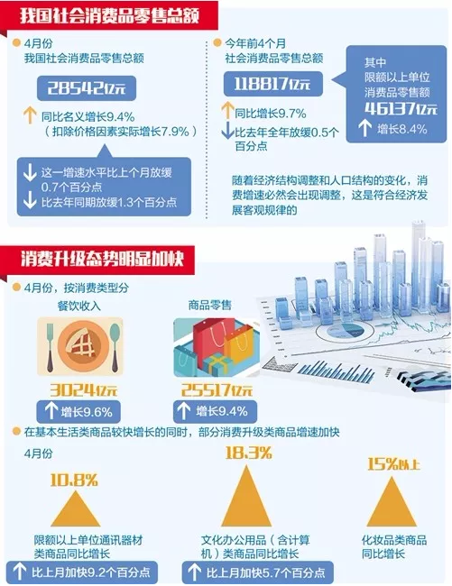 今年前4個(gè)月,社會(huì)消費(fèi)品零售總額118817億元,同比增長9.7%,比去年全年放緩0.5個(gè)百分點(diǎn)。其中,限額以上單位消費(fèi)品零售額46137億元,增長8.4%。
