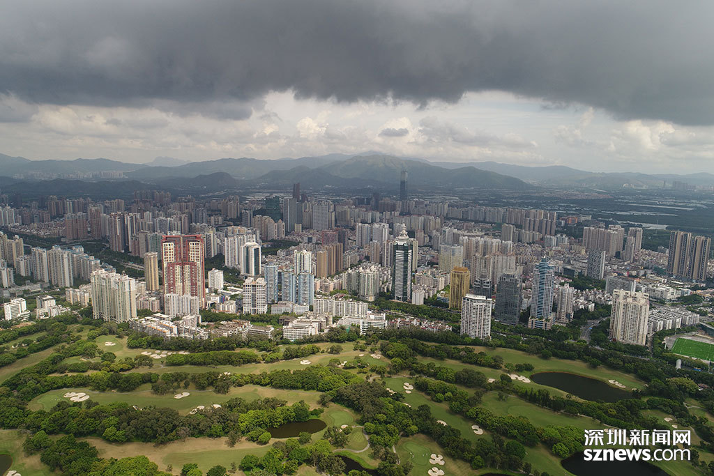 烏云籠罩下的平安大廈與深圳高爾夫俱樂部球場(chǎng)