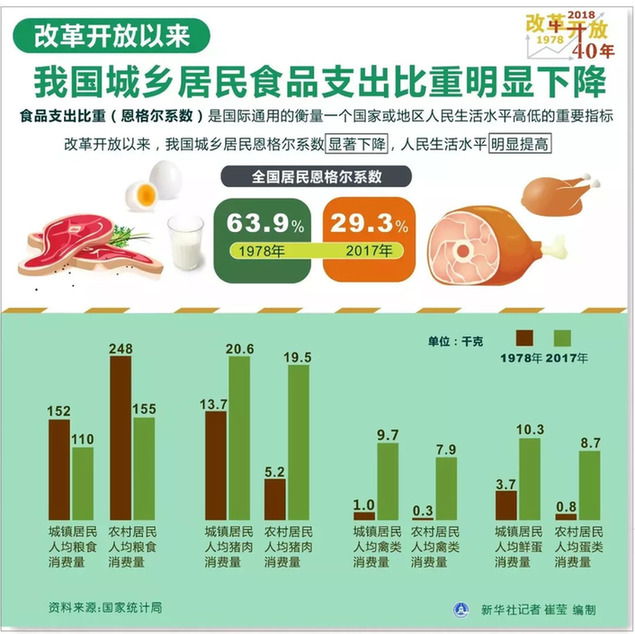 ② 國(guó)家統(tǒng)計(jì)局?jǐn)?shù)據(jù)顯示,改革開放以來(lái),我國(guó)城鄉(xiāng)居民食品支出比重明顯下降。