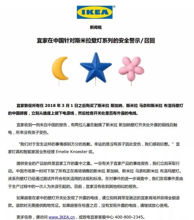 9月19日,宜家中國(guó)網(wǎng)站發(fā)布公告,宣布召回斯米拉(SMILA)系列3款兒童燈具(分別為斯加納、馬奈、布洛馬)。