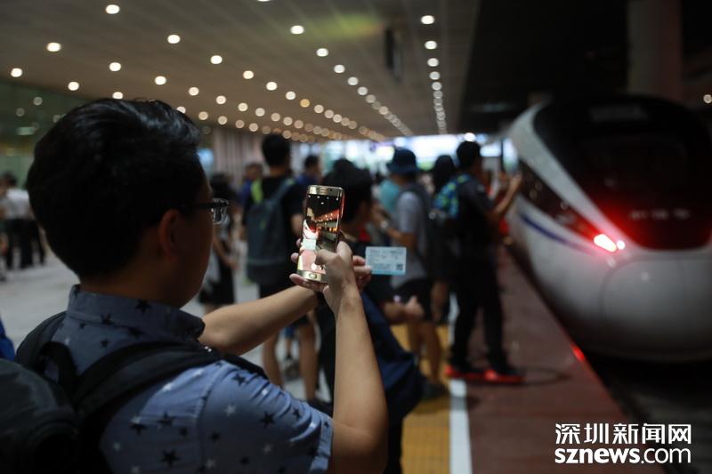 凌晨6點30分許,乘坐第一班深北至香港高鐵的旅客在拍照留念