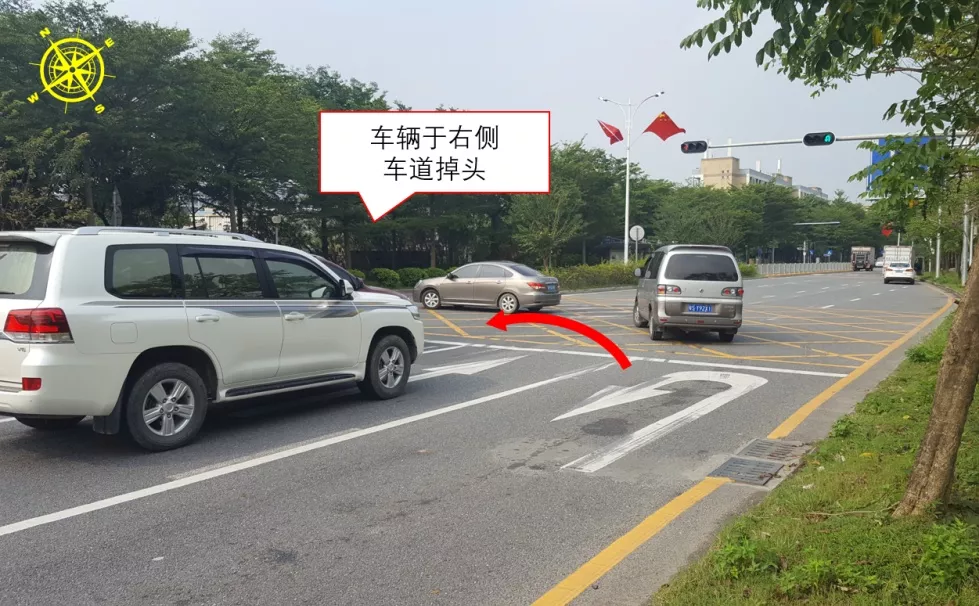 福鳳/騰豐三路口東側(cè)為鳳凰山旅游區(qū),通勤車流較多?,F(xiàn)狀路口未設(shè)置紅綠燈,人車交織嚴(yán)重,交通秩序混亂,易發(fā)交通事故。9月14日,深圳交警啟用福鳳/騰豐三路口信號(hào)燈。為解決掉頭車轉(zhuǎn)彎半徑不足問題,進(jìn)一步在距路口約96米處開設(shè)掉頭口,并以最外側(cè)車道作為掉頭車道,同時(shí)與福鳳/騰豐三路口實(shí)施聯(lián)動(dòng)設(shè)置燈控掉頭。該路口是寶安首個(gè)“一機(jī)兩控”+外側(cè)掉頭微創(chuàng)新路口。