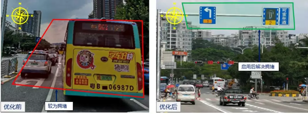 2.龍翔大道/吉祥路口啟用可變車道,相關(guān)路口平均周期減少約10秒 為解決龍翔大道/吉祥路口擁堵問題,深圳交警對龍翔大道/龍城大道、龍翔大道/建設(shè)、龍翔大道/吉祥、龍翔大道/如意等4個(gè)路口實(shí)施可變車道及燈控掉頭口綜合管控措施,緩解上述路口平峰與高峰之間存在的分時(shí)段排隊(duì)不均、掉頭車輛與過街行人交織隱患問題,優(yōu)化措施實(shí)施后,相關(guān)路口的平均周期減少約10秒。 龍翔大道/吉祥路口南進(jìn)口可變車道運(yùn)行情況點(diǎn)贊