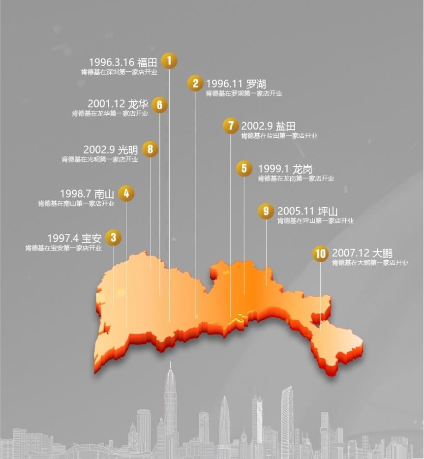 2007年,是深圳的大年份,也是肯德基的大年份。2007年,深圳人均GDP達(dá)到10684美元,首次超過1萬美元??系禄拈_店數(shù)量也在那一年突破了100家,達(dá)到108家。同時(shí),肯德基完成了對現(xiàn)在深圳十區(qū)的開店布局。