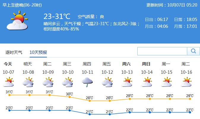 預(yù)計(jì)10月7-9日我市多云間晴天,氣溫23℃-31℃,空氣濕度將略有回升,但最小相對(duì)濕度仍在50%或以下,干燥天氣持續(xù)。未來三天天氣總體穩(wěn)定,氣溫波動(dòng)不大,適合外出活動(dòng),戶外活動(dòng)需多補(bǔ)充水分,適當(dāng)做好護(hù)膚措施。