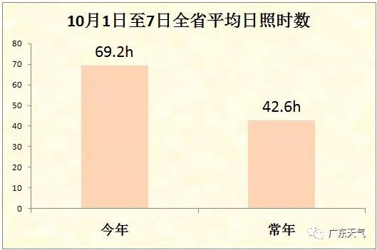 10月1日到7日,全省平均日照時(shí)數(shù):今年69.2h,常年42.6h,1951年以來排名第一。