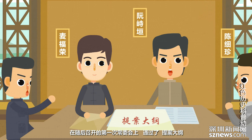 該動畫片圍繞中共寶安縣第一次黨員代表大會作了重點講述。1928年2月23日,根據(jù)廣東省委的指示,中共寶安縣委在燕川素白陳公祠召開第一次黨員代表大會。大會認真總結廣州起義失敗的原因和教訓,克服悲觀主義和盲動主義,建立新的領導核心,選舉產(chǎn)生了中共寶安縣第三屆委員會。在隨后的召開的第一次常委會上,通過了《提案大綱》,決定重新整頓各級黨組織,進一步發(fā)展黨員;加強宣傳工作,創(chuàng)辦農(nóng)民學校、夜校、翻印《紅旗》、《布爾什維克》等黨內刊物及各種宣傳品。