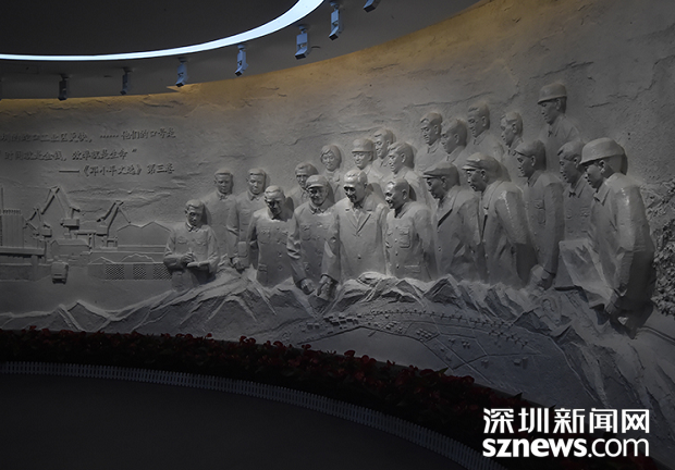 浮雕還原了1984年鄧小平第一次南巡期間,鄧小平、楊尚昆、王震等中央領(lǐng)導(dǎo)聽取袁庚介紹蛇口工業(yè)區(qū)發(fā)展情況的歷史一刻。
