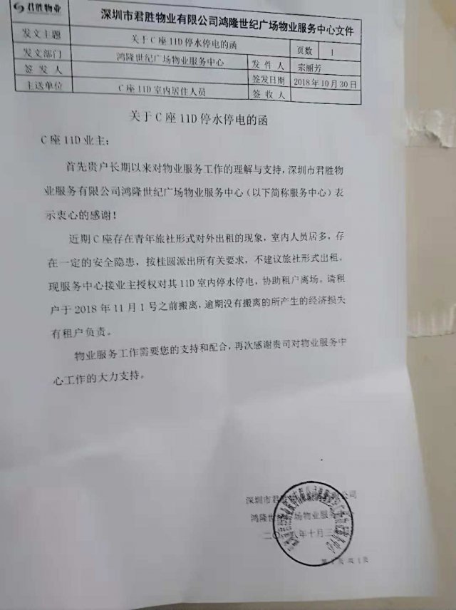 10月30日鴻隆世紀廣場物業(yè)服務(wù)中心物業(yè)發(fā)出關(guān)于 C座11D停水停電函,表示 C座存在青年旅社形式對外出租的現(xiàn)象,室內(nèi)人員居多,存在安全隱患,按桂園派出所有關(guān)要求,不建議旅社形式出租。業(yè)主授權(quán)物業(yè)中心對11D進行室內(nèi)停水停電,協(xié)助租戶離場,并要求租戶于11月1日之前搬離。