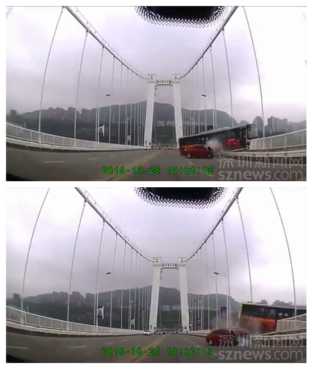重慶22路公交墜江瞬間視頻截圖來自事發(fā)時路過大橋的小汽車行車記錄儀