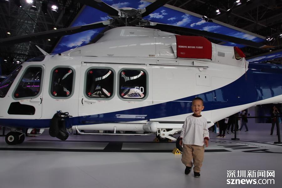 靜態(tài)展示館內(nèi)的直升機(jī)和萌娃