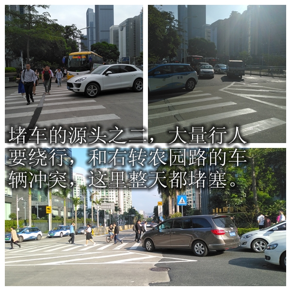 自2017年連通深南大道兩側(cè),可供行人通行的人行天橋被拆卸后,行人都只能從人行隧道過街。但奇怪的是,人行隧道的東出口處是一片被隔離、被荒廢的“孤島”,這讓需要從此出口通行的市民很尷尬。即使避開這個出口,選擇繞行,又容易在農(nóng)園路口與右轉(zhuǎn)車輛發(fā)生沖突?!罢娴暮転殡y我們啊?!笔忻駞窍壬C實了步行通過該路段的“艱難”。