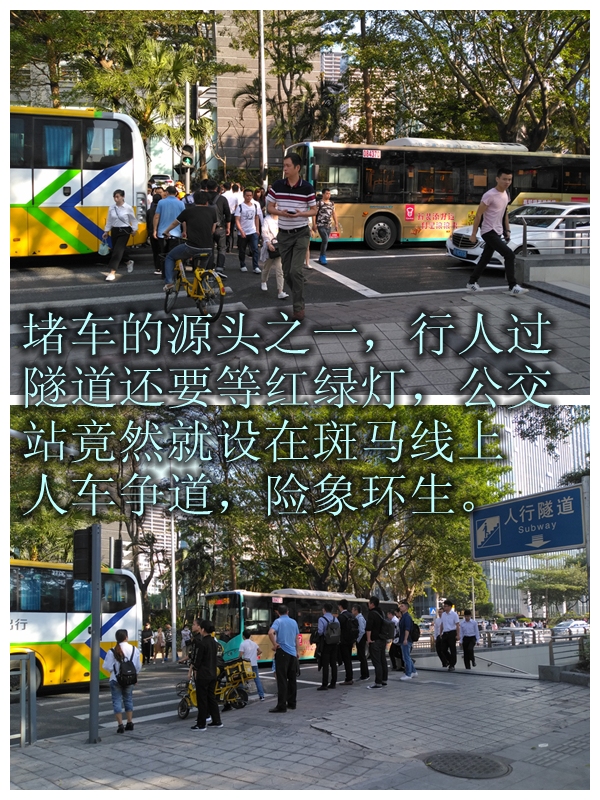 而在進入人行隧道前,又需要等紅綠燈,且公交車站就設(shè)在這紅綠燈前的斑馬線上?!拔也幻靼诪楹卧诮煌ㄟ@樣混亂的地方,要設(shè)置公交車站,也不知為何‘為難’的都是市民。”網(wǎng)友“深圳大胡子”為這里每天通行的行人鳴不平,他希望能把招商銀行公交站原來的港灣式站臺恢復(fù),方便市民乘車,也希望能盡快恢復(fù)正常的過街通道。