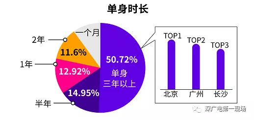 針對單身時長的調(diào)查發(fā)現(xiàn),有高達(dá)50.72%的人為單身三年以上的“長單族”,“長單族”占比最多的城市前三為北京、廣州和長沙。