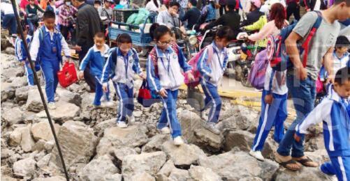 成群的學生在碎石上走過,旁邊小道擠滿三輪、電動單車(網友“伊戈達拉”供圖)