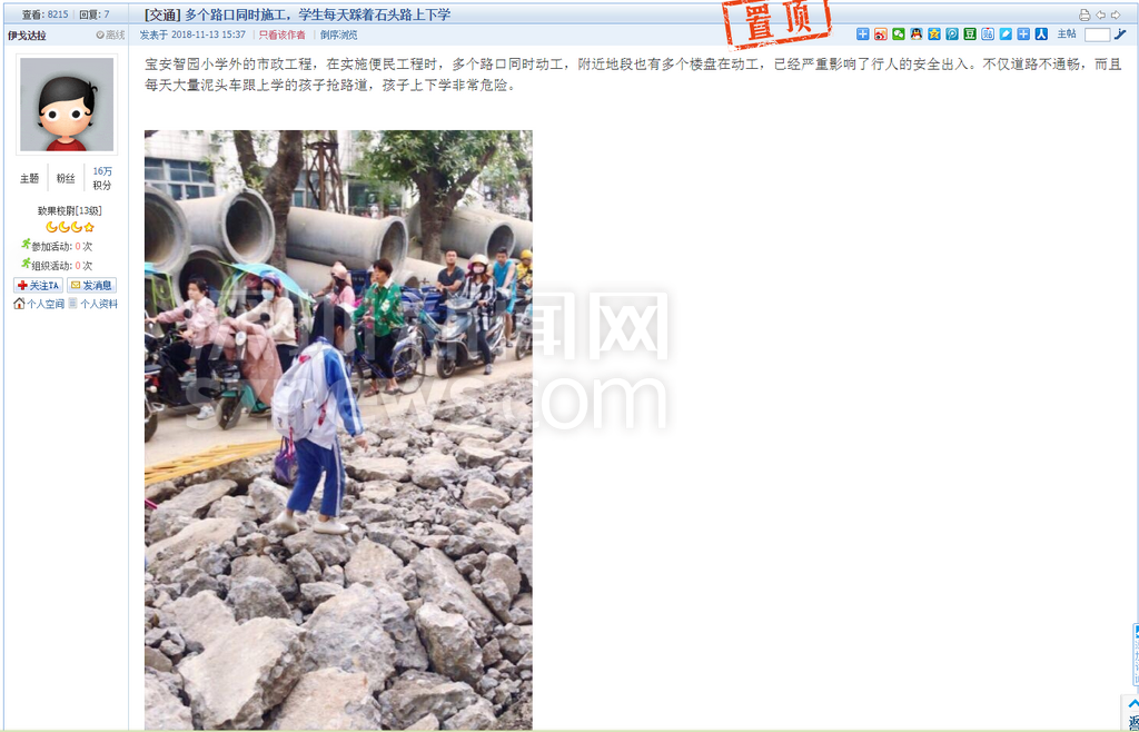 另有網友跟帖表示:同學們求學路坎坷,看得揪心!從現(xiàn)場圖可以看到,學生上下學都要穿過工地。路面被挖開,道路邊上只留下很窄的一條小道。上下學高峰期,成群結隊的學生在碎石穿行,旁邊小道上行人、三輪、電動單車堵成一鍋粥,存在很大的安全隱患。