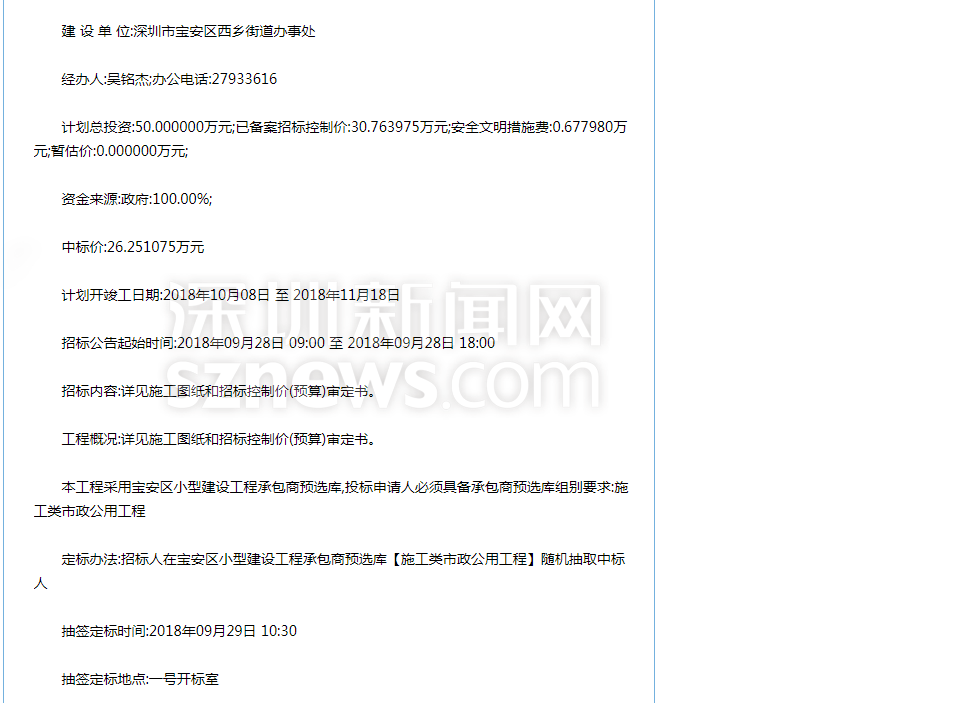 針對網(wǎng)友反映的情況,記者查閱相關(guān)資料發(fā)現(xiàn),寶安智園小學門前的施工工程于2018年9月28日公開招標。