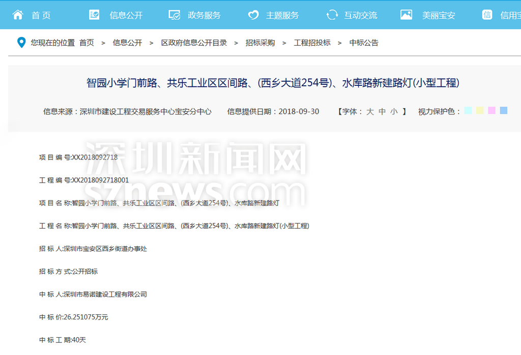 記者從寶安西鄉(xiāng)街道官網(wǎng)中標(biāo)公告獲悉,智園小學(xué)門(mén)前路工程施工中標(biāo)單位是深圳市易諾建設(shè)工程有限公司,中標(biāo)工期是40天。據(jù)招標(biāo)公告顯示計(jì)劃開(kāi)竣工時(shí)間是2018年10月08日至2018年11月18日。網(wǎng)友希望施工能夠如期完工,道路能夠早日恢復(fù)暢通,施工期間,最好能夠?qū)⑹┕?chǎng)地和人行道隔開(kāi),確保學(xué)生人身安全。
