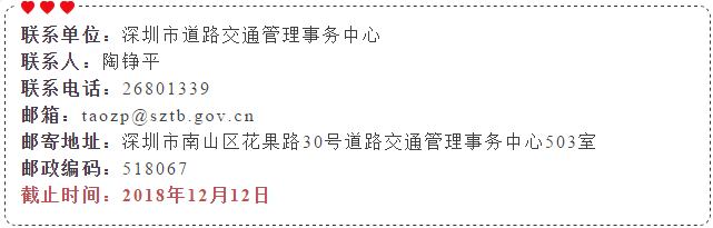 根據(jù)《深圳市機動車道路臨時停放管理辦法》相關規(guī)定,市交委現(xiàn)就以上18條道路路邊停車泊位設置方案公開征求意見。市民如有意見和建議,可于2018年12月12日前反饋給市交委。郵寄地址為深圳市南山區(qū)花果路30號道路交通管理事務中心503室。