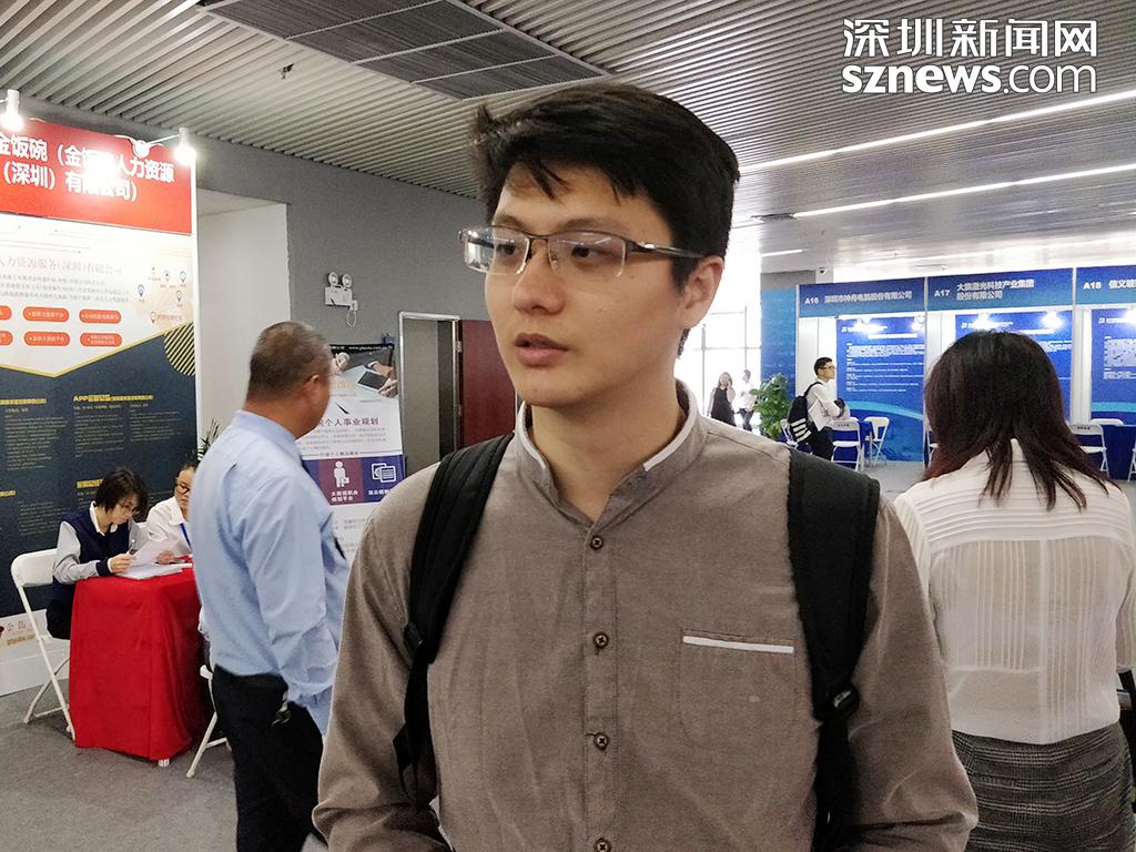 現(xiàn)場應(yīng)聘的劉先生已有一年的工作經(jīng)驗,此次高端人才招聘會的信息是通過深圳市人力資源社會保障局的微信公眾號得知,故來到現(xiàn)場希望尋得一個對口的崗位。